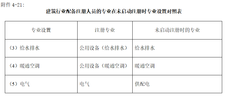 3.建筑工程丙級資質的專業(yè)設置中,(3)給水排水、(4)暖通空調專業(yè)各配備1名專業(yè)技術人員,其中1人為注冊人員。